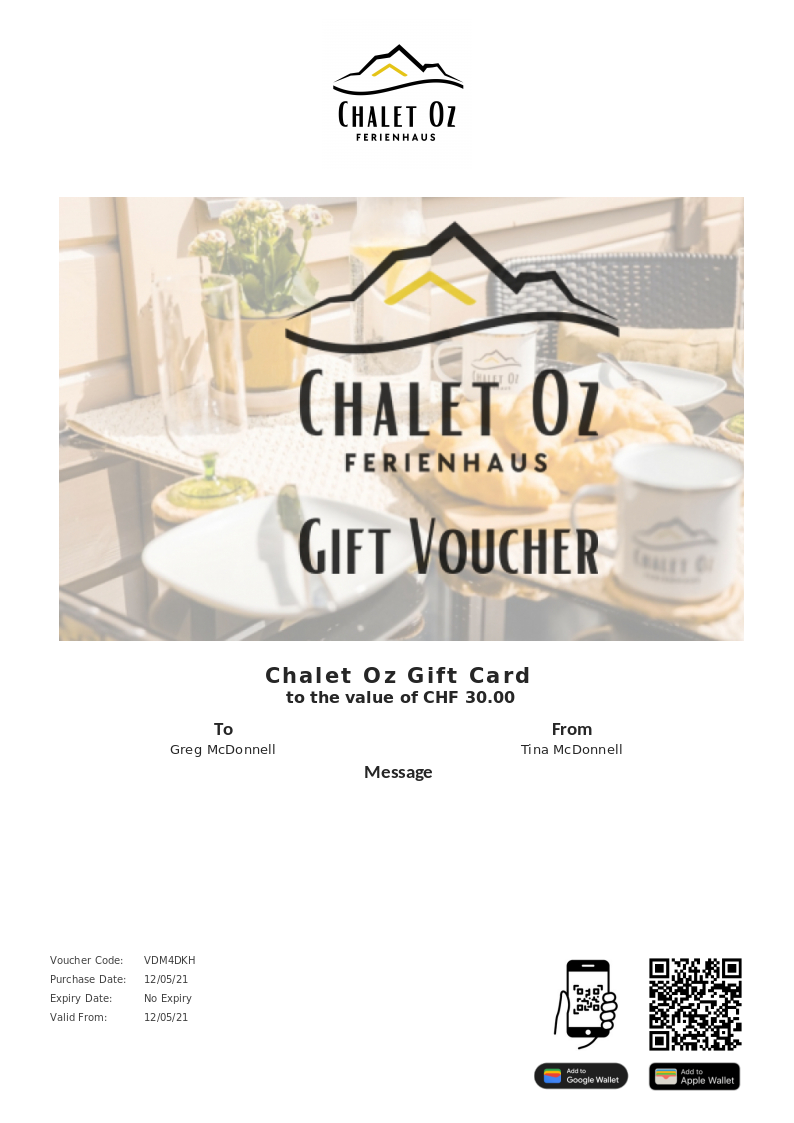 Chalet Oz allows you to purchase instantly printable gift vouchers, special offers and tickets using the Voucher Connect platform.